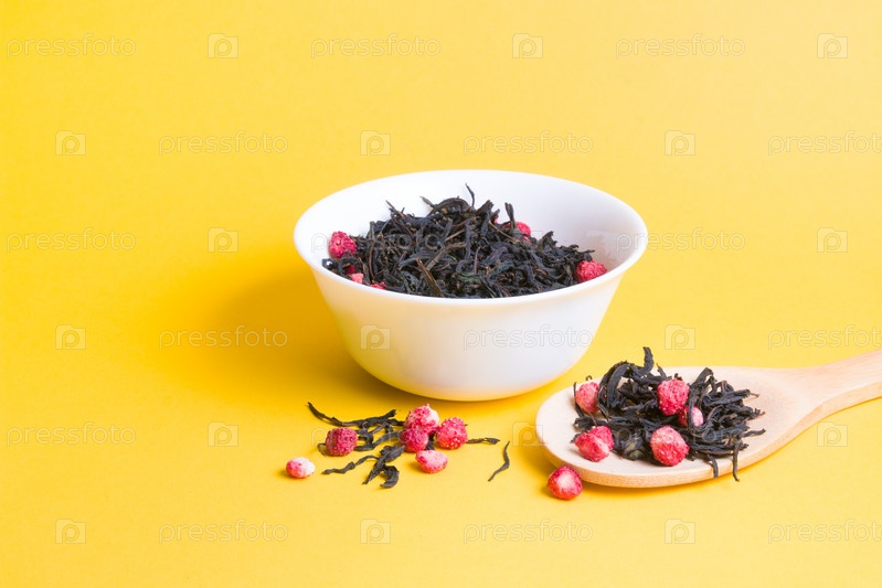 Чай с сушеной клубникой в белой миске, клубничный чай в большой деревянной ложке на желтом фоне, пространство для копирования, посыпанные ягоды и сушеные чайные листья