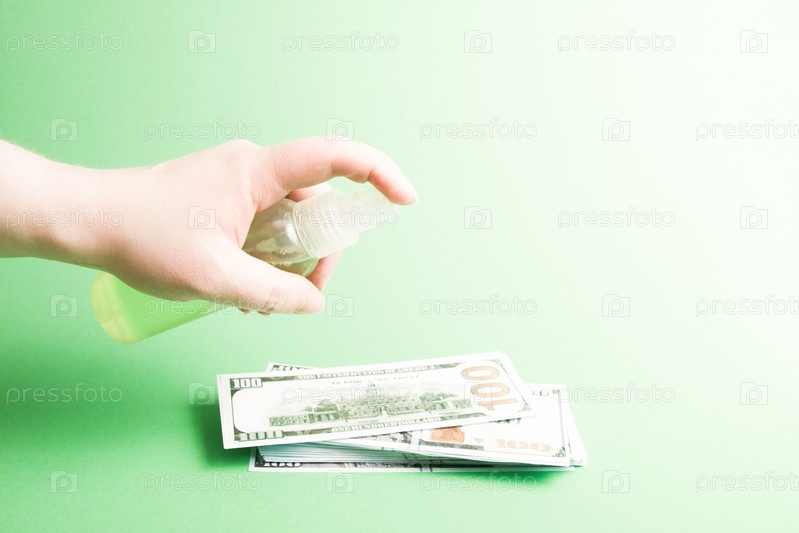Рука обрабатывает стопку стодолларовых купюр дезинфицирующим спреем