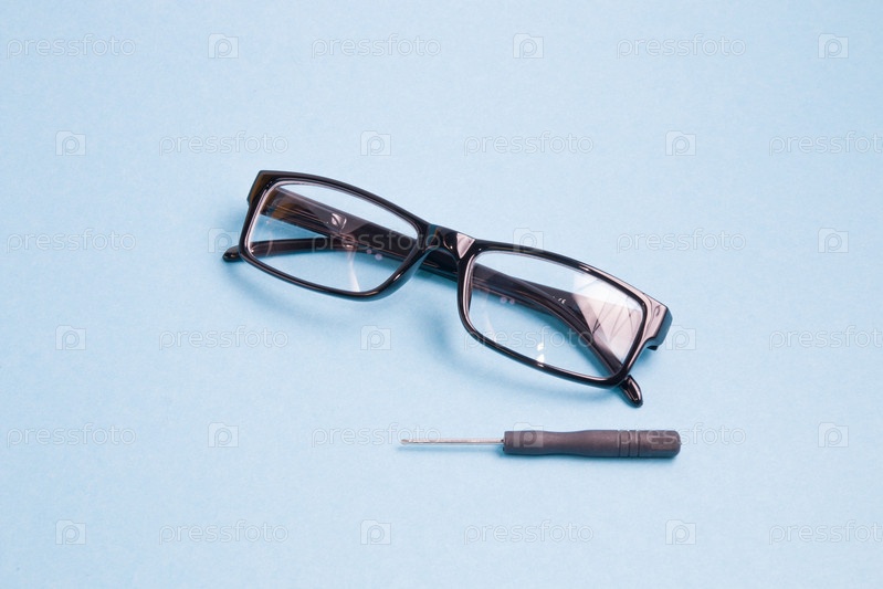 Очки в черной пластиковой оправе и маленькая отвертка на голубом фоне, разбитые очки в ремонте