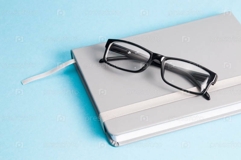 Очки в черной оправе лежат на черном кожаном блокноте, синий фон, пространство для копирования