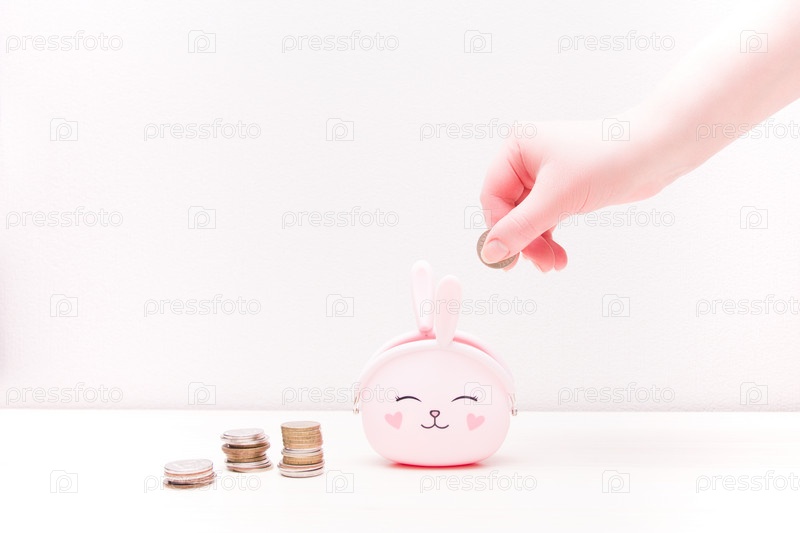 Женская рука кладет монету в розовый силиконовый кошелек в форме кролика и ушей, рядом стопки монет, светлый фон, пространство для копирования, экономия любви, концепция экономии денег