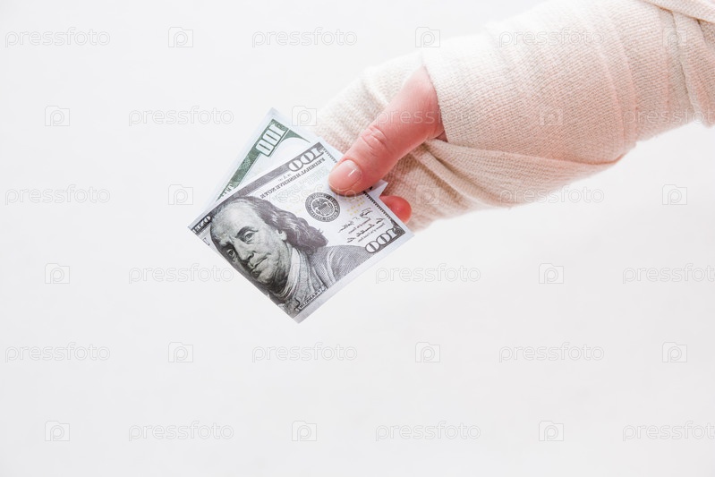 Женская рука в повязке держит 100 долларов