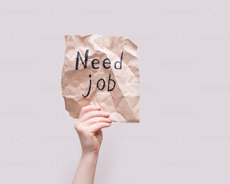 Женская рука держит скомканный клочок коричневой оберточной бумаги с надписью нужна работа, концепция безработицы, светлый фон, пространство для копирования