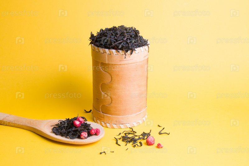 Домашний чай с сушеной клубникой в банке из бересты на желтом фоне, большая деревянная ложка с чаем из земляники, посыпанный чай и сушеная клубника, пространство для копирования
