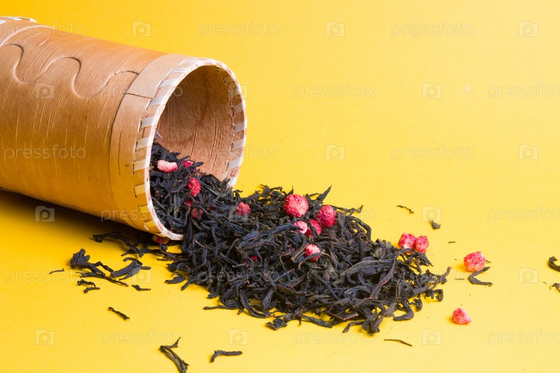 Чай с сушеной клубникой в коробке из бересты, клубничный чай в деревянной коробке на желтом фоне, пространство для копирования, посыпанные ягоды и сухие чайные листья