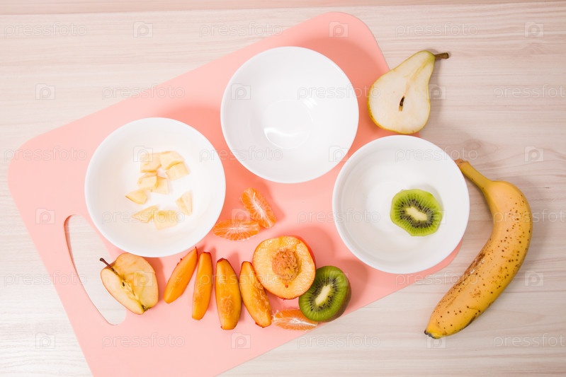 Несколько белых салатников и нарезанные фрукты на разделочной доске персикового цвета, процесс приготовления фруктового салата на деревянном столе, концепция здоровых закусок, вид сверху