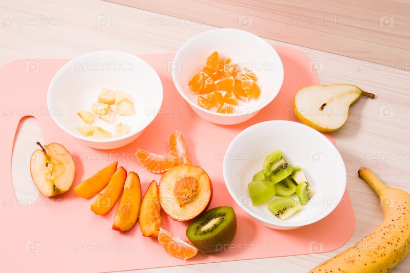 Несколько белых салатников и нарезанные фрукты на разделочной доске персикового цвета, процесс приготовления фруктового салата на деревянном столе, здоровая закуска для всей семьи
