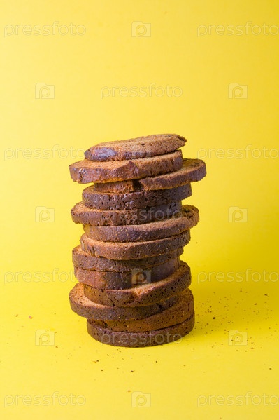 Несколько ломтиков поморников с изюмом, башня из круглых хлебцев на желтом фоне