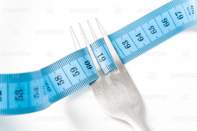 Синяя измерительная лента и вилка на белом фоне концепция диеты голодание потеря веса и похудение
