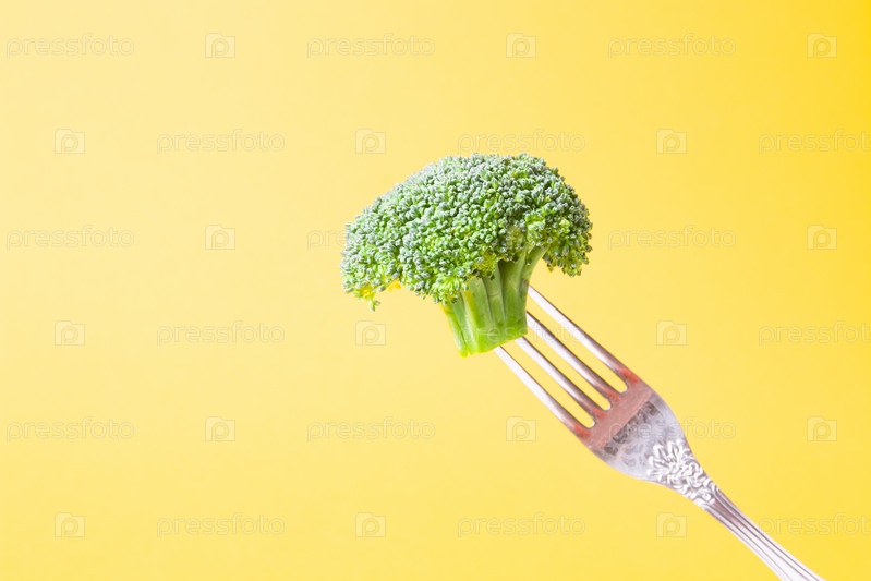 Свежая зеленая брокколи на вилке желтом фоне место копия