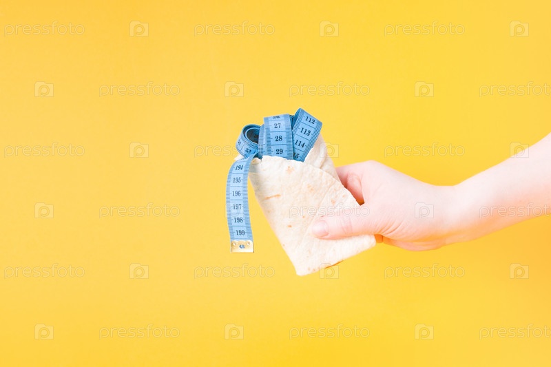 Женская рука держит синюю измерительную ленту, завернутую в лаваш, концепцию диеты, желтый фон, пространство для копирования, потерю веса и правильный образ жизни