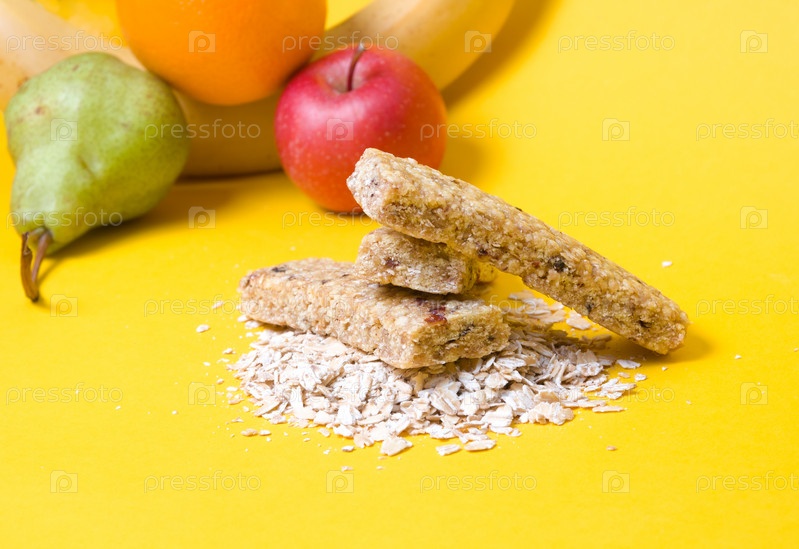 Несколько мюсли и фруктовых батончиков на куче сухой овсянки, на заднем плане фрукты размыты, желтый фон, концепция правильного питания, вкусная и здоровая закуска
