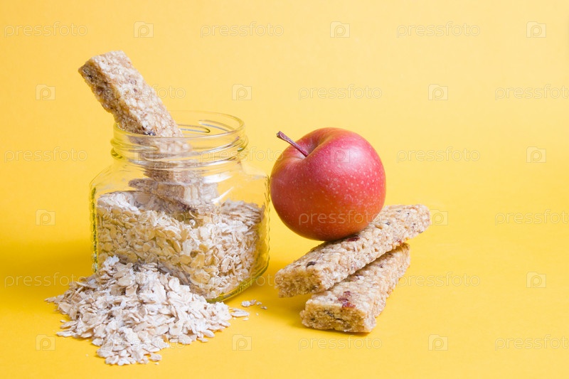 Стеклянная банка с овсянкой, яблоком и несколькими протеиновыми батончиками для перекуса на желтом фоне, посыпанная овсянка, пространство для копирования, концепция здорового правильного питания
