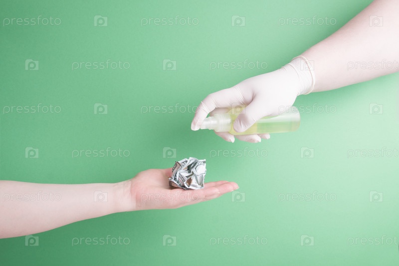 В руке скомканная стодолларовая купюра, которую опрыскивают дезинфицирующим спреем рукой в резиновой медицинской перчатке, зеленый фон, пандемия коронавируса, карантин в США