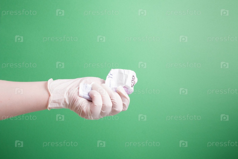 Женская рука в резиновой белой медицинской одноразовой перчатке держит скомканную купюру в 500 евро на зеленом фоне
