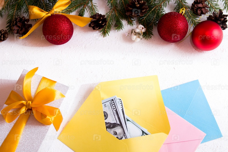 Деньги в конверте, подарочная коробка с золотым бантом и рождественские украшения на белом фоне, елочные игрушки, шишки, еловые ветки, рамка