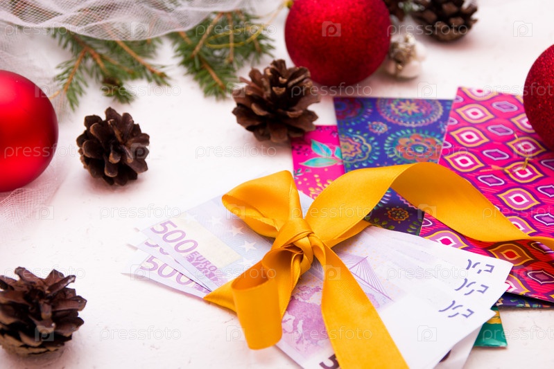 Рождественские подарки новый год, деньги, евро купюры, подарочная коробка, золотая лента, елочные игрушки, еловые ветки, вид сверху, копия пространства