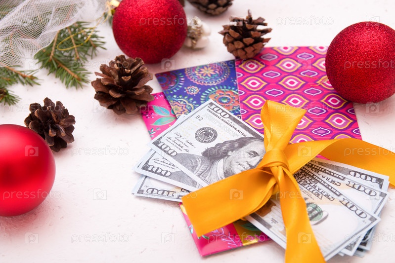 Деньги в подарок на новый год, рождество, доллары перевязанные золотым летом, бантик, конверты для купюр
