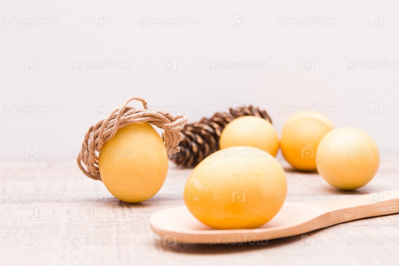 Золотые яйца на деревянном столе, яйцо в венке из бумажной нити, желтое яйцо на деревянной ложке, еловая шишка и светлый фон, пространство для копирования, пасхальный фон