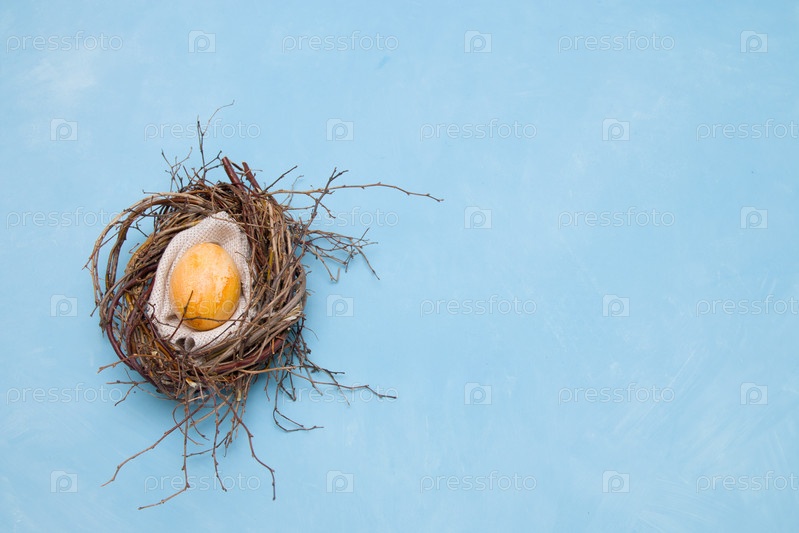Золотое пасхальное яйцо в импровизированном гнезде на синем фоне копией пространства вид сверху