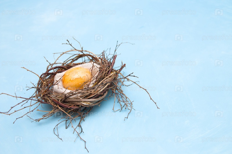 Золотое пасхальное яйцо в импровизированном гнезде из ветвей на синем фоне пространство для копирования вид сверху, пасхальная открытка, место для текста