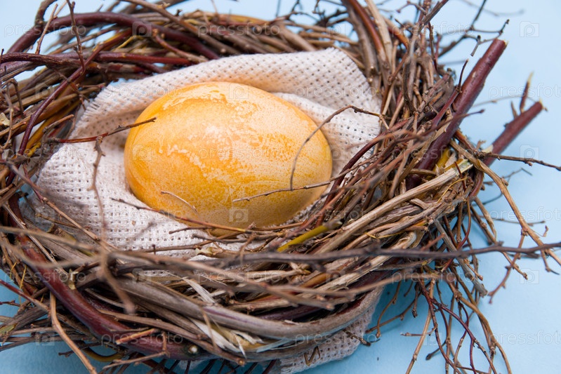 Золотое пасхальное яйцо в импровизированном гнезде из веток на синем фоне крупным планом