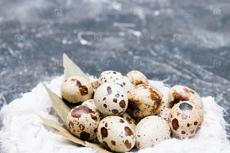Перепелиные яйца в белом вязаном черном гнезде, украшенном пространством для копирования фона из сухого лаврового листа. Пасхальный фон, крупный план