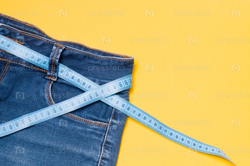 Синяя измерительная лента вдевается в джинсы вместо ремня, синие джинсы на желтом фоне, пространство для копирования, концепция потери веса и контроля веса, измерение объема тела