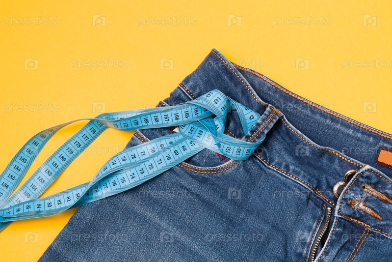 Синяя измерительная лента вдевается в джинсы вместо ремня, синие джинсы на желтом фоне, пространство для копирования, концепция потери веса и контроля веса, измерение объема тела