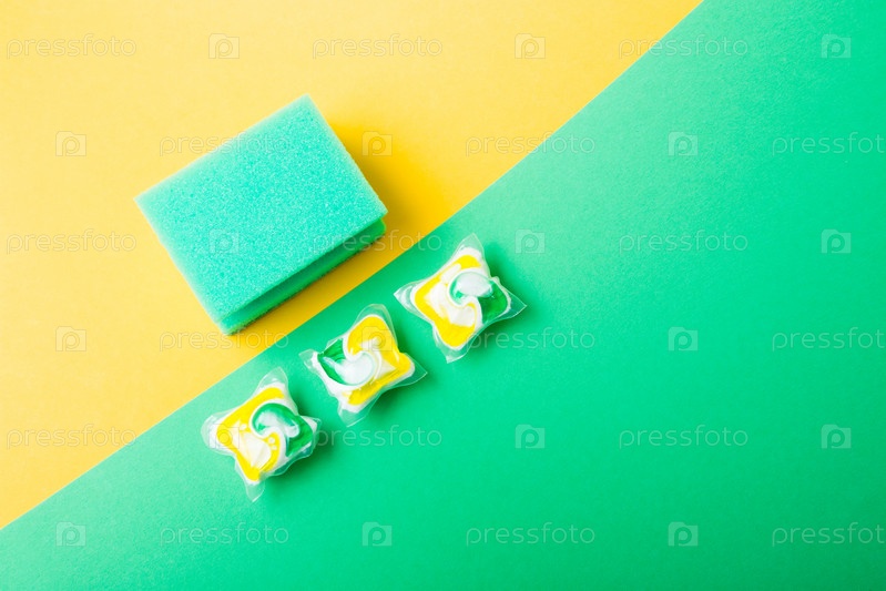 Гелевые капсулы для посудомоечных машин и губки на зеленом и желтом фоне мест копирования сверху, выбор между мытьем посуды руками или в посудомоечной машине