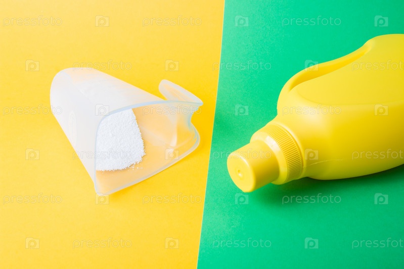 Желтая пластиковая бутылка с гелем для стирки детской одежды и мерный стакан со стиральным порошком лежат на желто-зеленом фоне