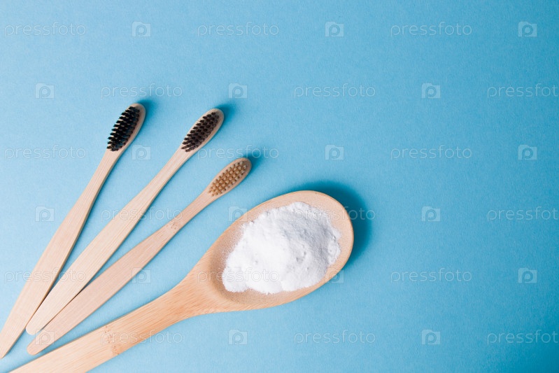 Три разные бамбуковые щетки и деревянная ложка с газировкой на синем фоне, пространство для копирования сверху, концепция экологически чистого образа жизни