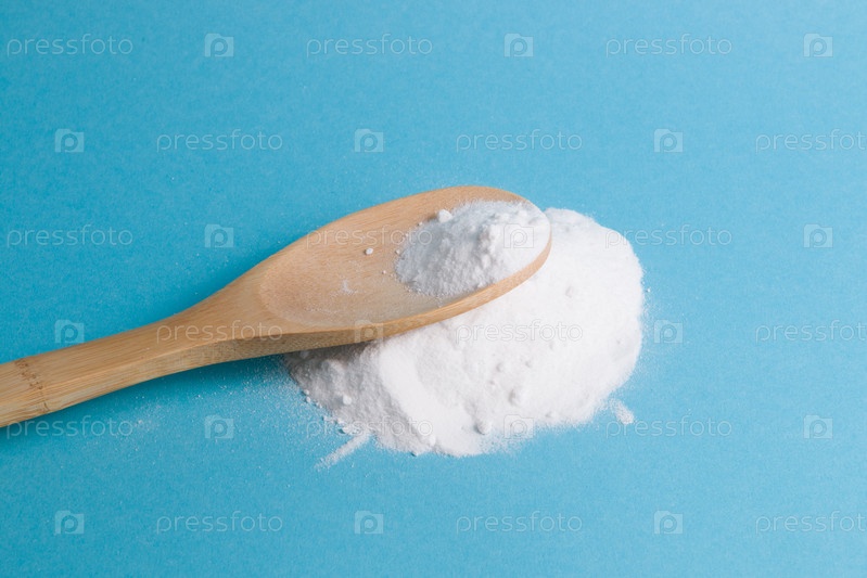 Деревянная ложка соды на куче соды на голубом фоне копировального пространства, экологически чистый образ жизни, натуральные средства для здоровья, кулинария и чистота