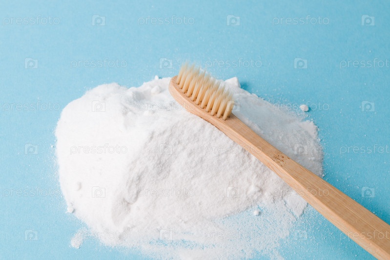 Бамбуковая зубная щетка на куче соды на синем фоне копирует чистку зубов концепция газировки, концепция образа жизни без отходов