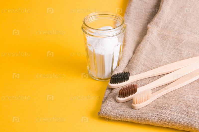 Натуральная ткань, несколько разных бамбуковых щеток и стеклянная банка газировки на желтом фоне, пространство для копирования, концепция экологически чистого образа жизни