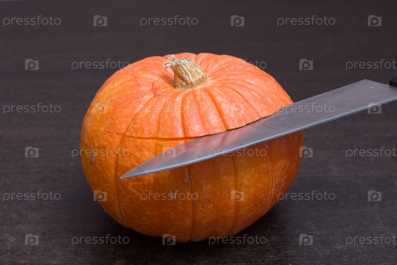 Железный острый нож режет оранжевую тыкву на коричневом деревянном столе