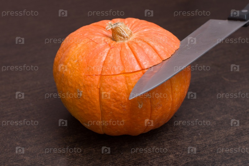 Железный острый нож режет оранжевую тыкву на коричневом деревянном столе