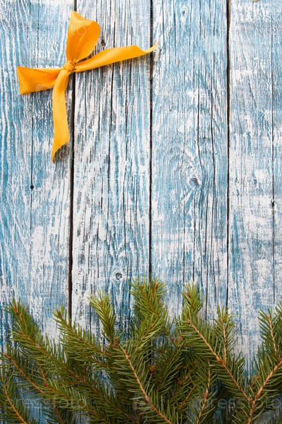 Еловые ветки и бант из золотой ленты на синем деревянном фоне, копия пространства, вид сверху