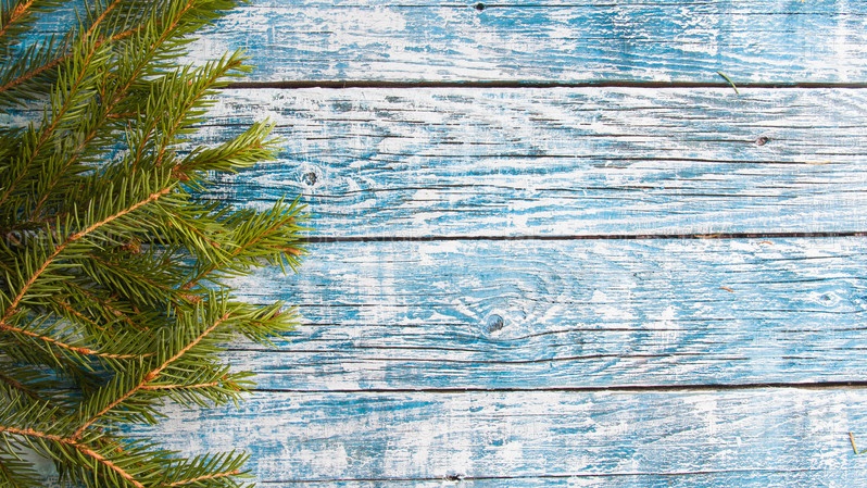 Еловые ветки на синем деревянном фоне, копия пространства, вид сверху
