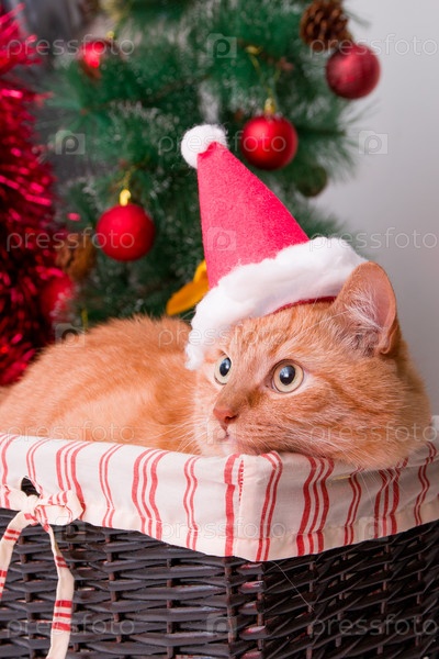 Рыжий кот в шапке деда мороза сидит в корзине на фоне наряженной елки