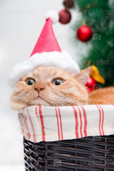 Рыжий кот в шапке деда мороза лежит в плетеной корзине на фоне наряженной елки
