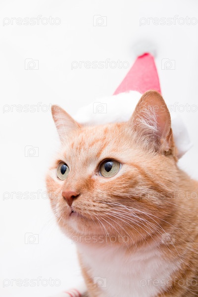 Портрет толстого милого рыжего кота в шапке санта-клауса на белом фоне