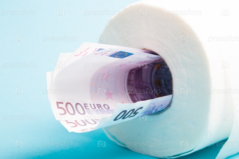 Рулон белой туалетной бумаги и несколько купюр на сумму 500 евро, деньги в рулоне туалетной бумаги, место для копирования на синем фоне