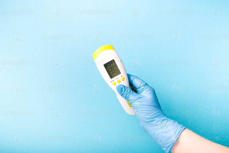 Инфракрасный бесконтактный термометр температуры в руке, рука в перчатке, мгновенное измерение температуры, очень высокая температура на термометре 39,7 градусов по Цельсию, пространство для копирования на синем фоне