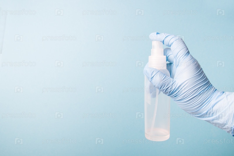 Рука в синей одноразовой медицинской перчатке держит антисептик в виде спрея, спиртовой раствор для дезинфекции поверхностей, гигиены и профилактики вирусных заболеваний