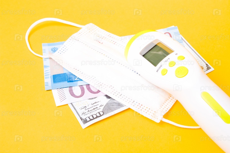 Три банкноты из разных стран, бесконтактный термометр для измерения температуры тела, белая защитная медицинская маска, желтый фон, место копирования, кризис 2020, концепция пандемии и карантина