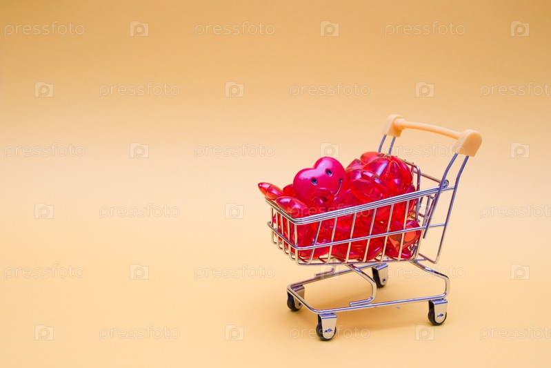 Миниатюрная продуктовая тележка, полная красных сердец на желтом фоне, место для копирования, покупки к празднику, поздравление с Днем святого Валентина, покупки к празднику