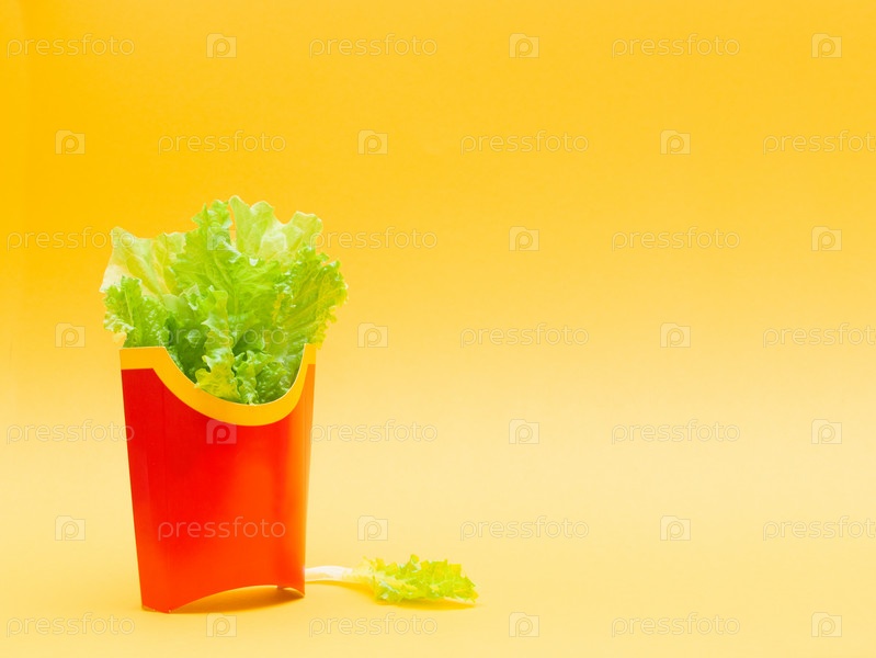 Свежие сырые зеленые листья салата в упаковке из красного картофеля фри на желтом фоне копией пространства, один лист лежит рядом, правильное питание, концепция здорового образа жизни, замена нездоровой пищи, фаст-фуд