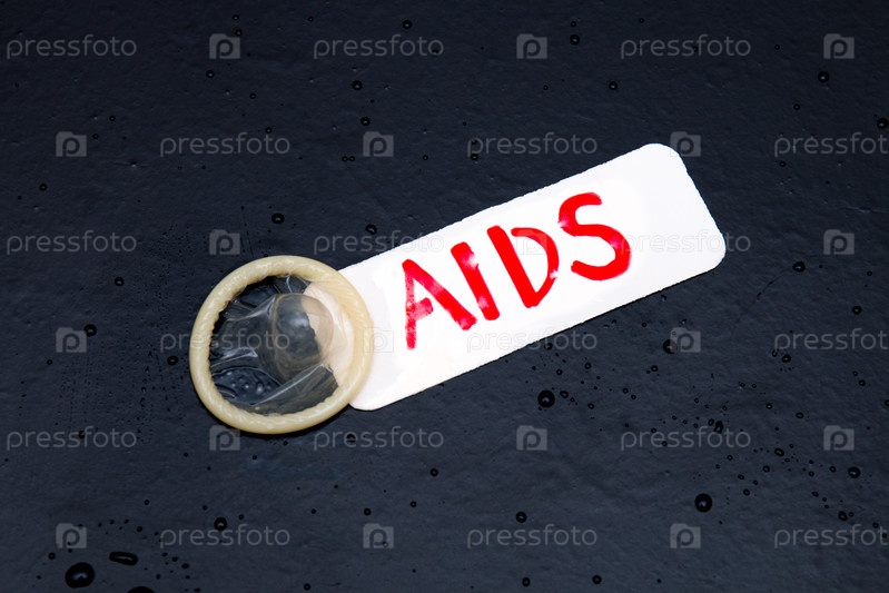 Презерватив и надпись СПИД на черном фоне с копией пространства