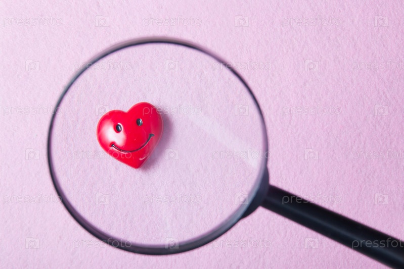 Улыбающееся сердце на розовом фоне и лупа, знакомства, поиск партнера, поиск любви на розовом фоне